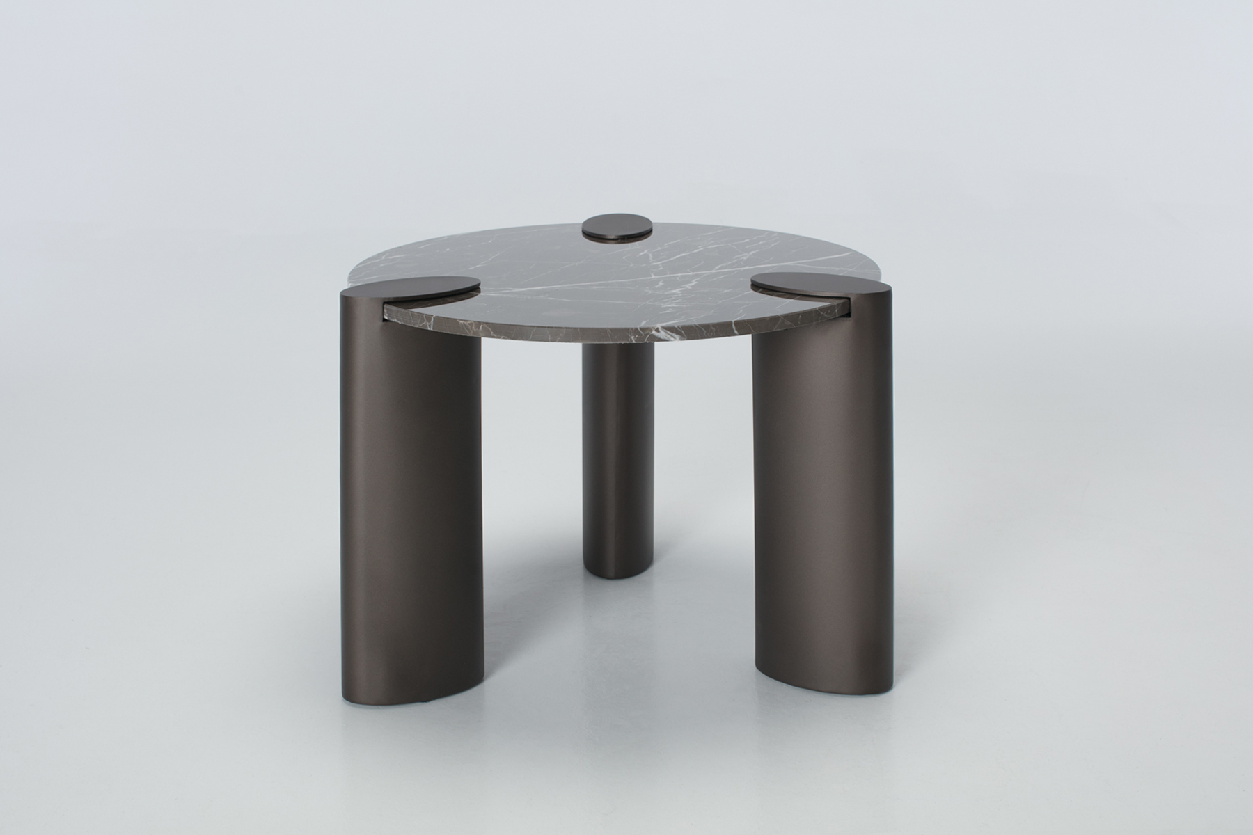 Sometimes a massive coffee table just gets in the way. This 60cm version is the perfect fix for smaller flats or awkward corners. It features a solid dark grey marble top that shows off natural, one-of-a-kind veining. The real standout is the leg design. Three chunky metal pillars wrap over the edge of the stone. It creates a bold, architectural look that feels properly modern. Because it is taller than the 90cm version, it works brilliantly as a standalone accent or tucked next to a deep sofa.