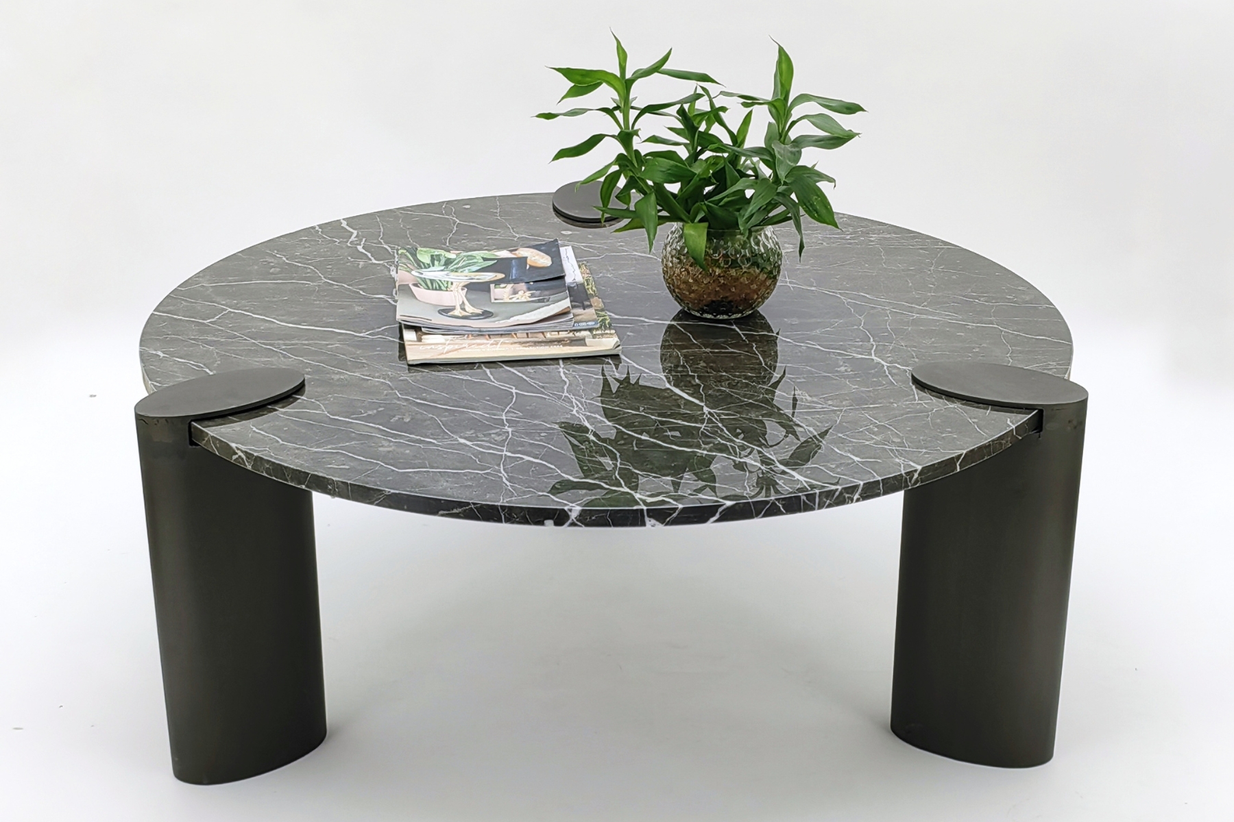 TL;DR: A low, round coffee table with a wide 90cm dark grey marble top and wrap-over legs. Big enough to anchor a living room, low enough to keep things relaxed. Works well in front of a larger sofa or layered over a soft rug. Real presence, no fuss.