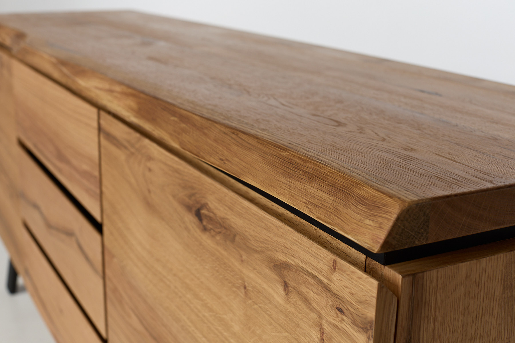 The Alder Sideboard is built to be substantial. The wide top surface is made from thick, solid oak wood, chosen for its rich grain and natural weight. What sets it apart is the striking live edge detail that runs along the to. An organic contour that confirms the authenticity of the wood and ensures no two pieces are exactly alike.