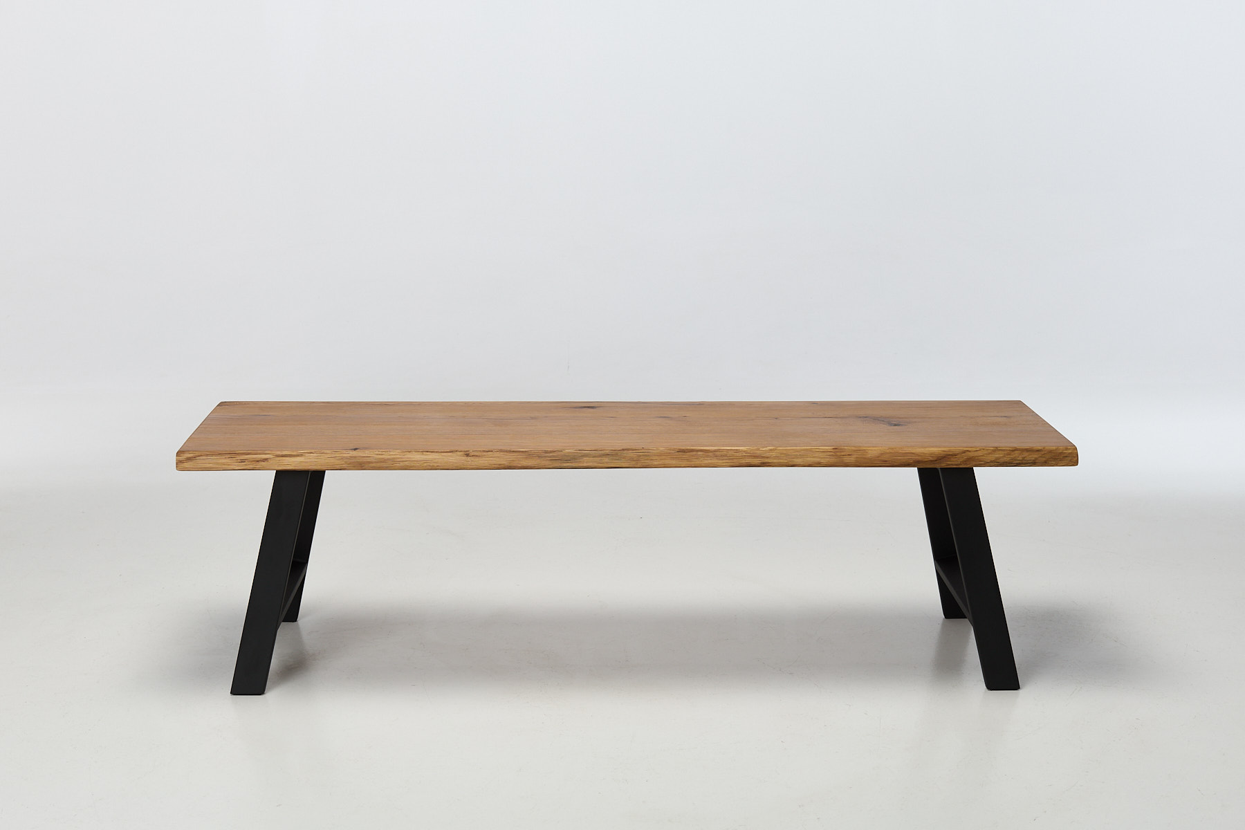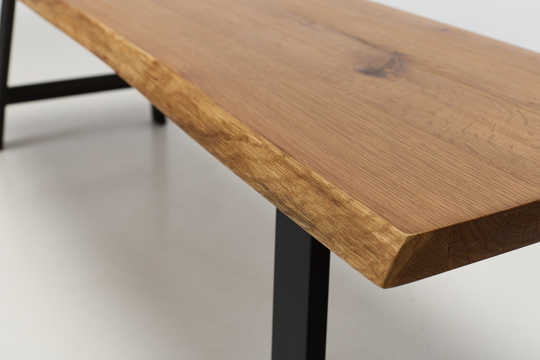 At the heart of the set is its honest, durable design. Both pieces feature thick, weighty tops made from premium solid oak wood, chosen for its strength and natural warmth. The shared Live Edge detail runs along the sides of the table and bench, following the wood’s original shape so no two pieces feel the same. The black metal legs add contrast and stability, with a clean A-frame design that keeps everything anchored. Together, the oak and metal create a bold modern rustic look that suits open-plan kitchens and dining rooms with texture and purpose.