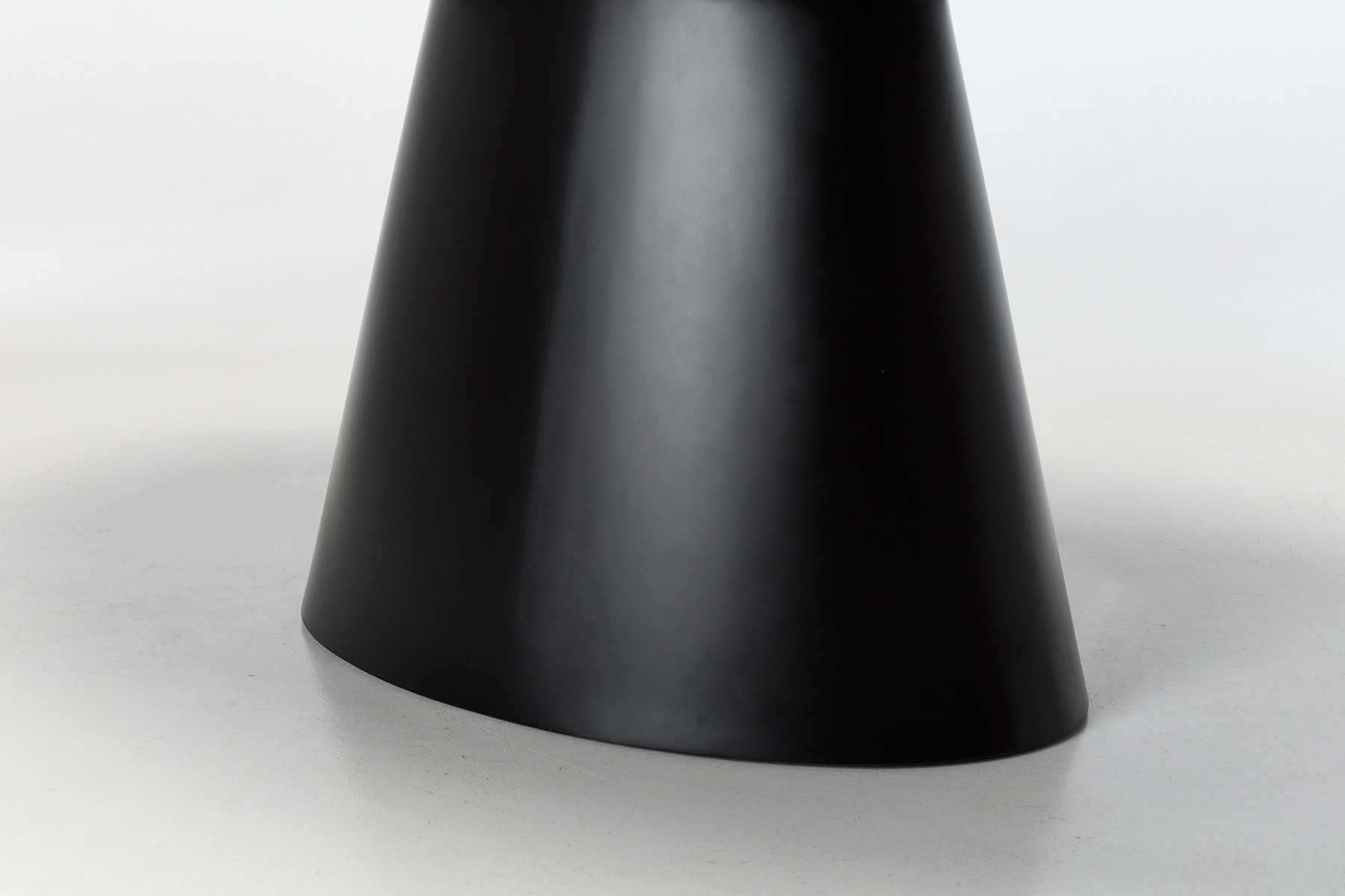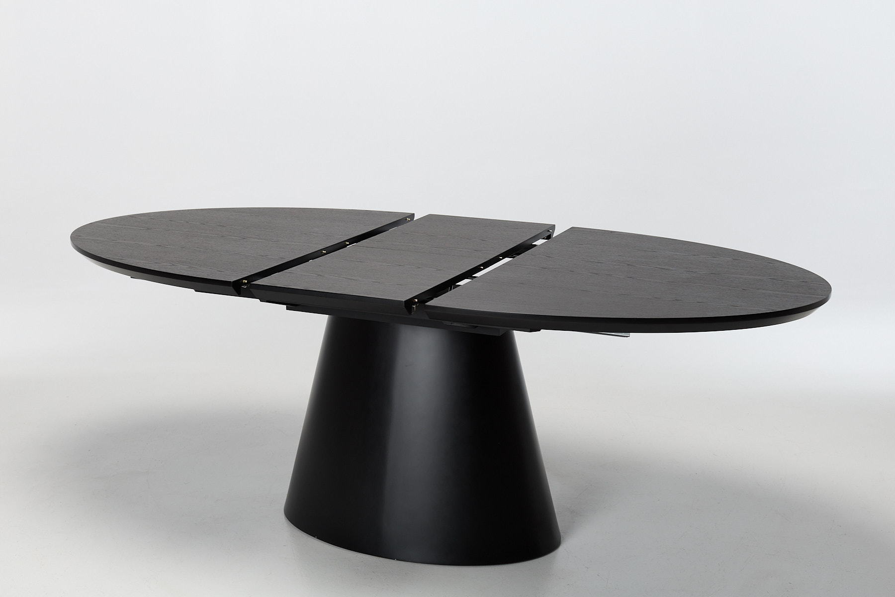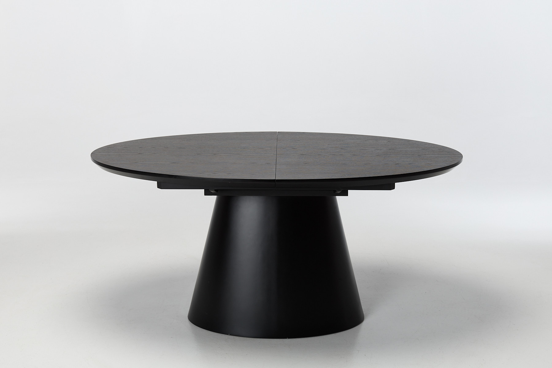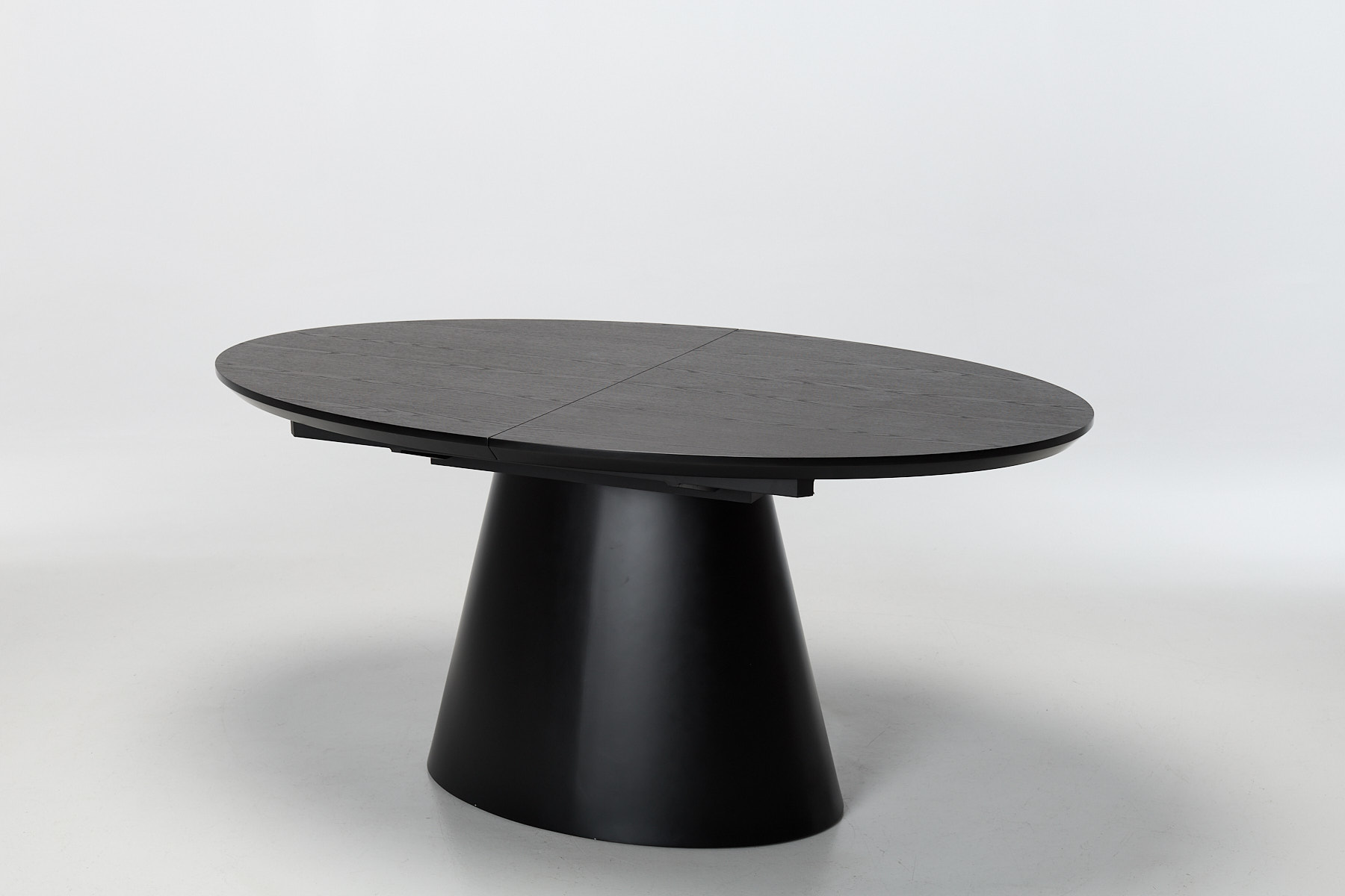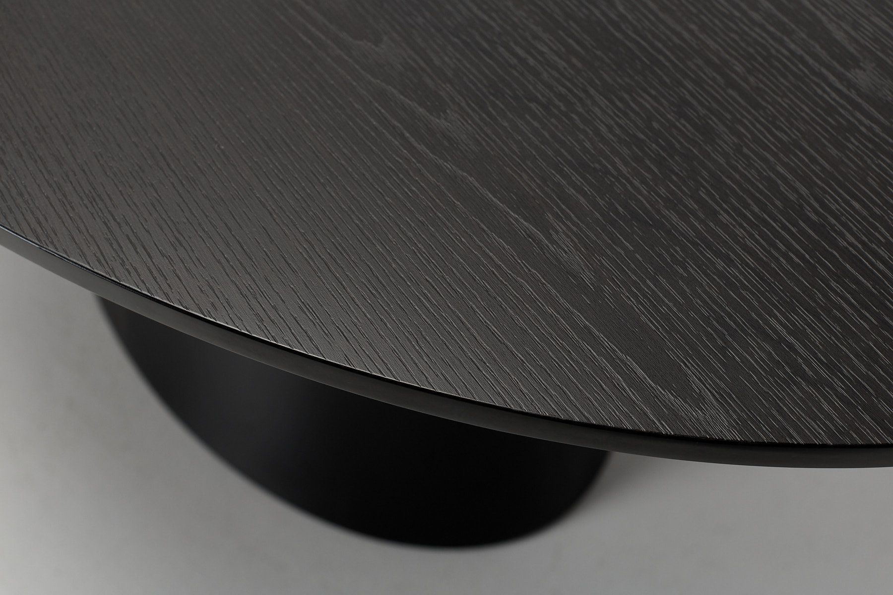The design centres on two smart choices: a wide oval top and a conical pedestal base. That base clears the floor for legs, bags and guests, giving you full access all the way round without the clutter of corner legs. The black veneer finish adds depth and texture, with a subtle grain that catches the light and gives the surface a tactile edge. The oval shape softens the footprint, making it easier to move around in tighter dining zones. Together, the top and base create a piece that feels settled, substantial and ready to earn its place in a modern home.