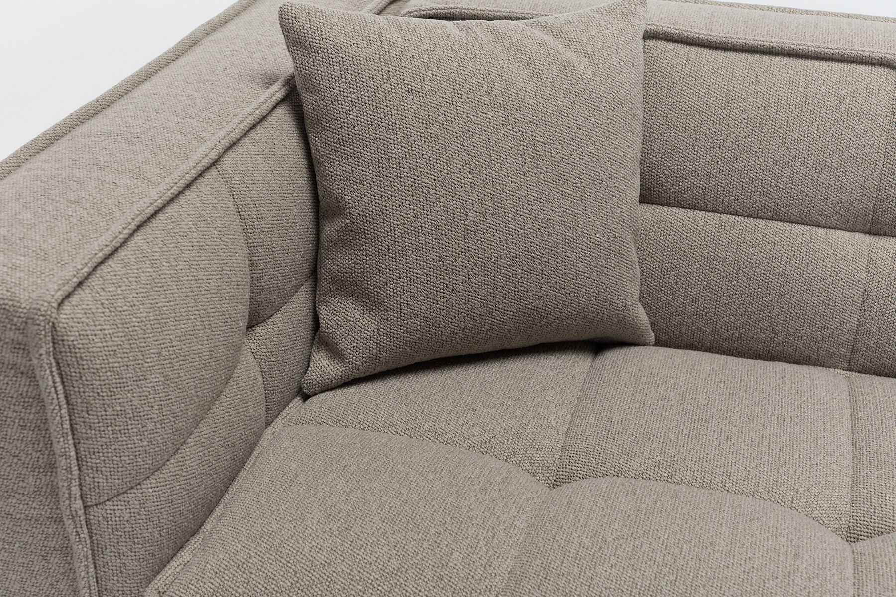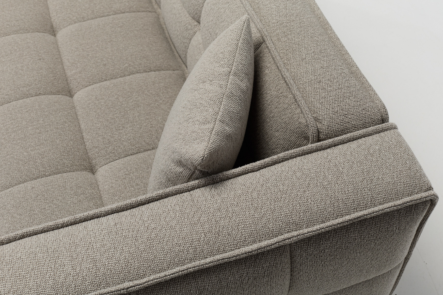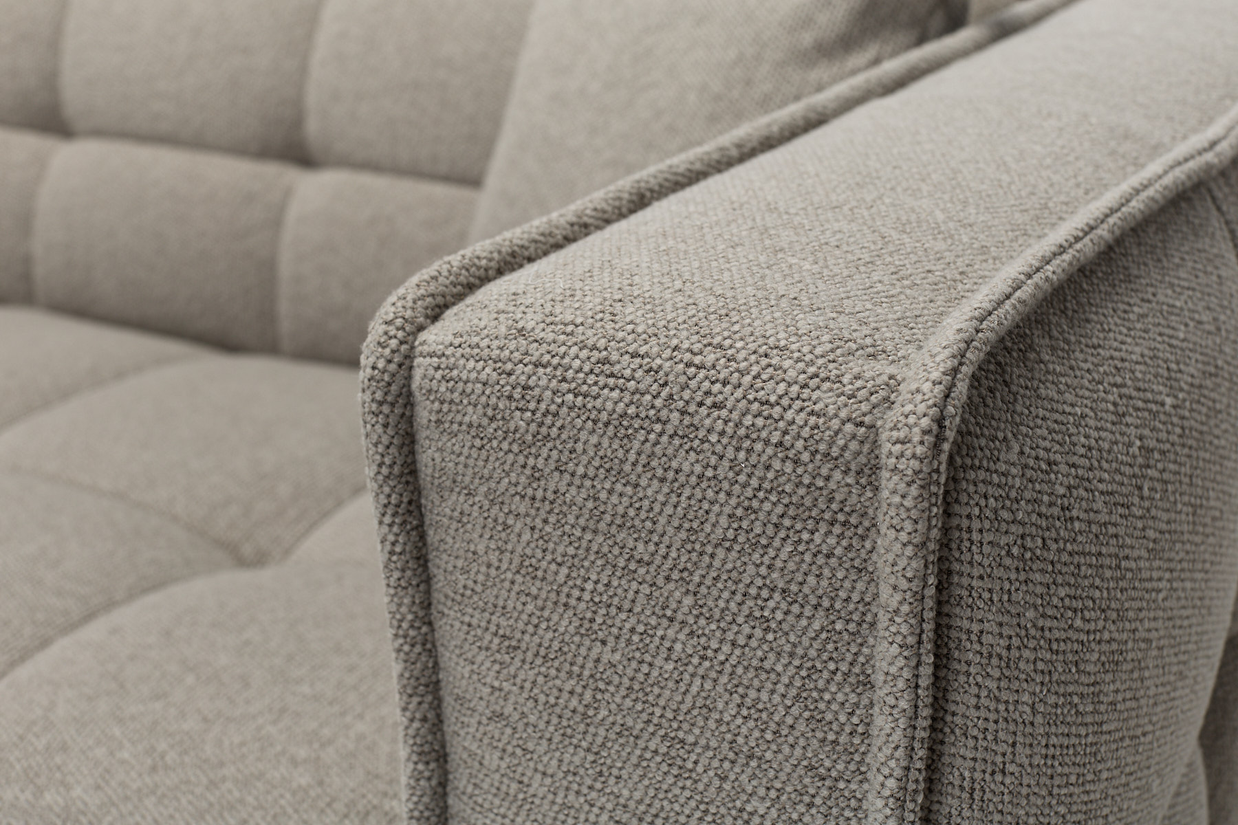 The construction of the Arta sofa blends sturdy craftsmanship with refined detail. It’s built around a classic tuxedo silhouette, where the squared armrests and low back meet at the same height, framing the seat with clean, confident lines. That structure is softened by traditional touches. Neat piping and deep button tufting across the geometric panels on the back and sides. The warm grey woven fabric adds texture and calm, giving your space a timeless neutral that’s easy to build around.
