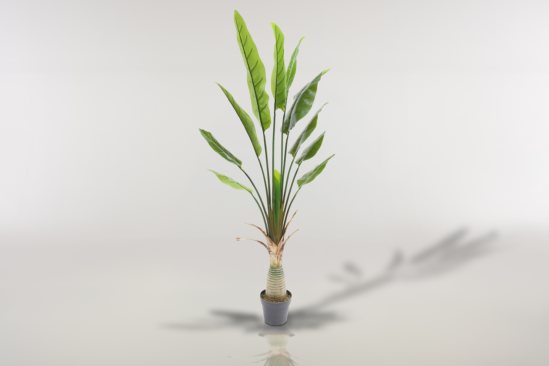• Wide paddle‑style leaves – Oversized fabric foliage that creates a clean, symmetrical fan unique to the Travellers palm