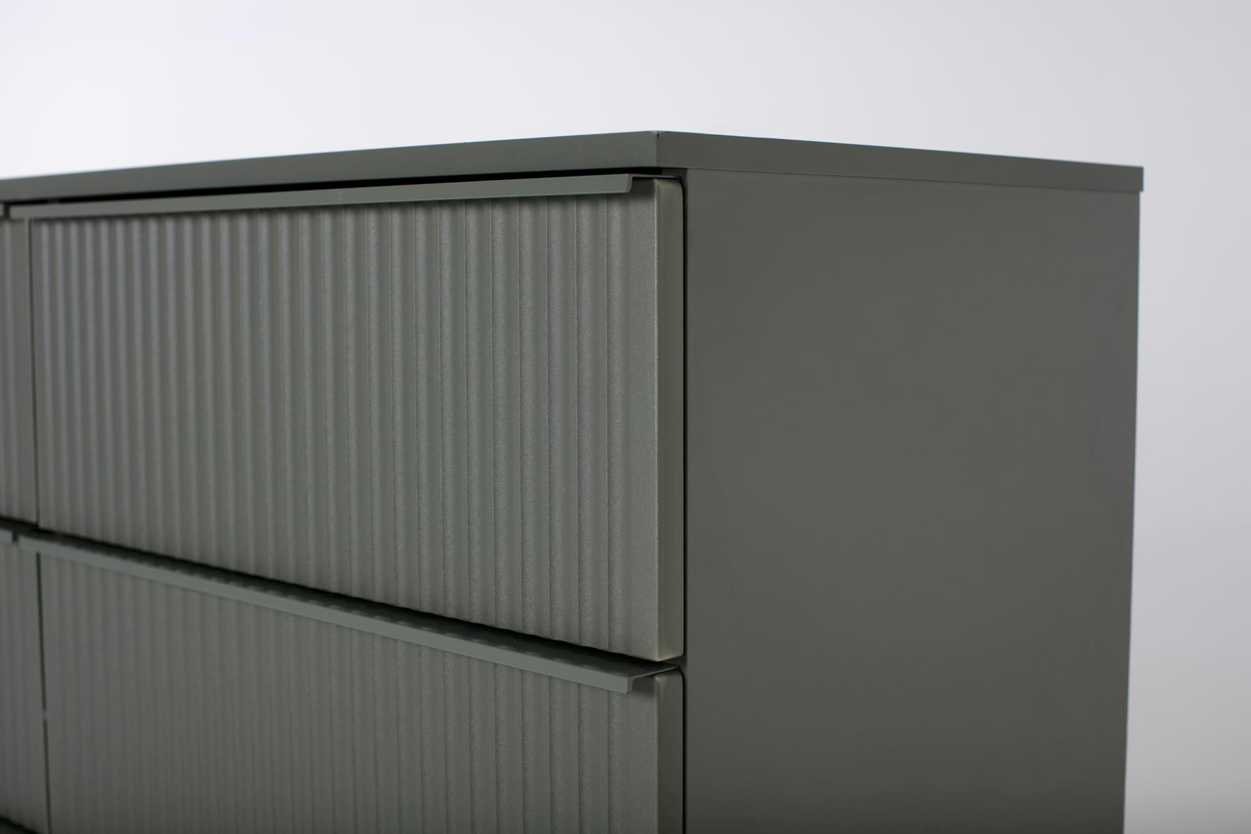 • Textured fluted fronts – The ribbed design adds a nice touch of detail and keeps the handleless drawers looking clean