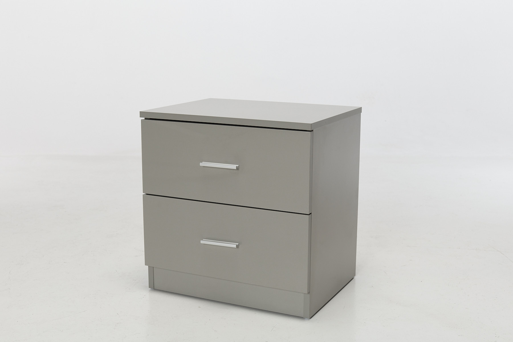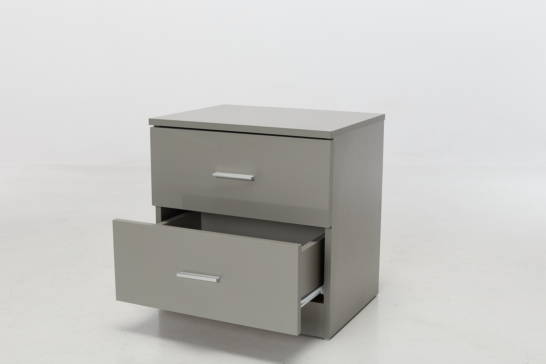 • Compact grey gloss bedside table with two drawers for everyday bedroom storage