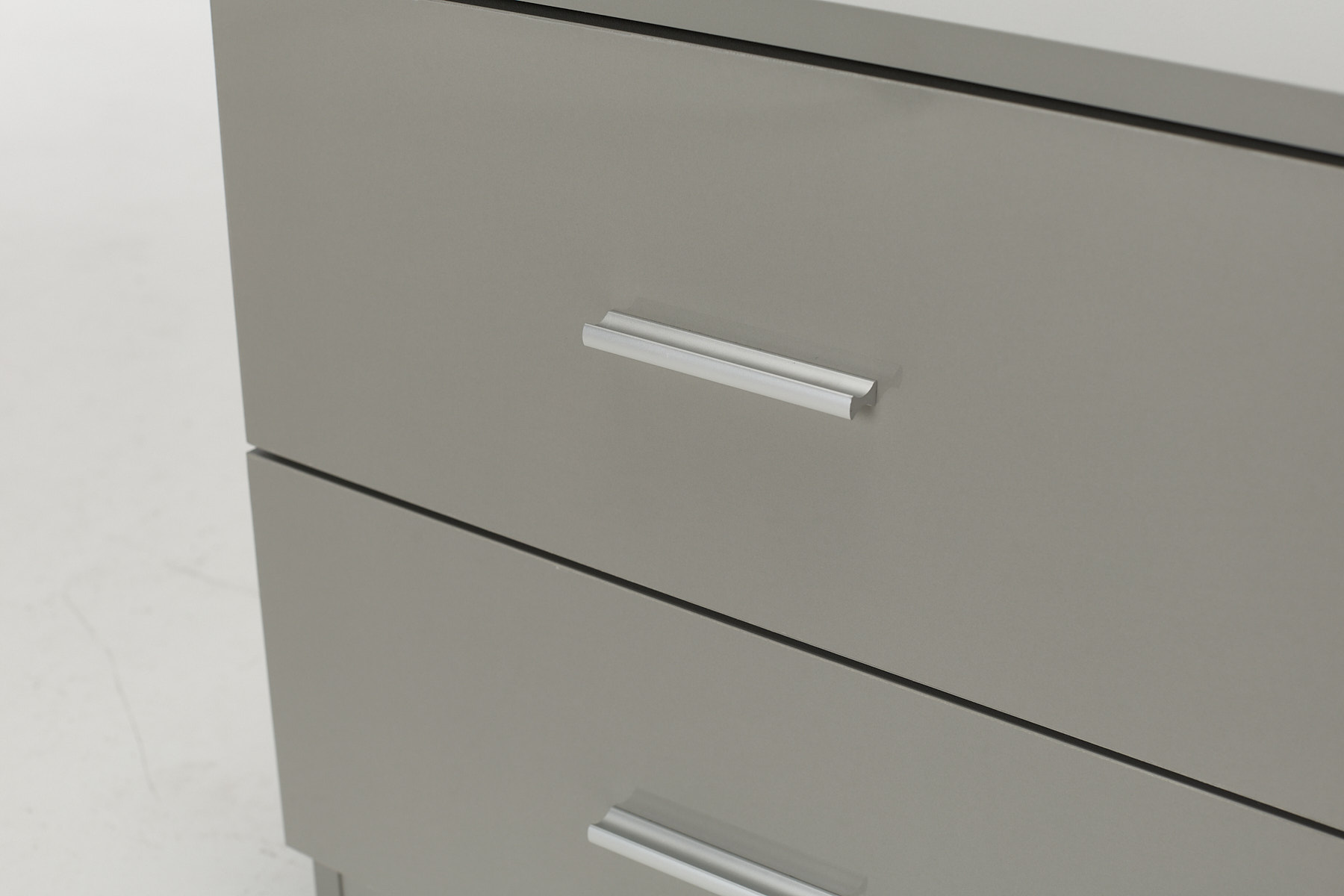 We have gone for a mid‑grey tone that feels fresh and balanced, acting as a great neutral base for navy or charcoal bedding. The two drawers move smoothly and have enough depth to swallow up all your chargers, books and skincare to keep the tabletop tidy. The silver‑tone handles add a crisp bit of contrast that echoes a sleek, urban modern palette. If you are into tonal stacking, try layering different grey shades to get that confident, put‑together look for your bedroom.
