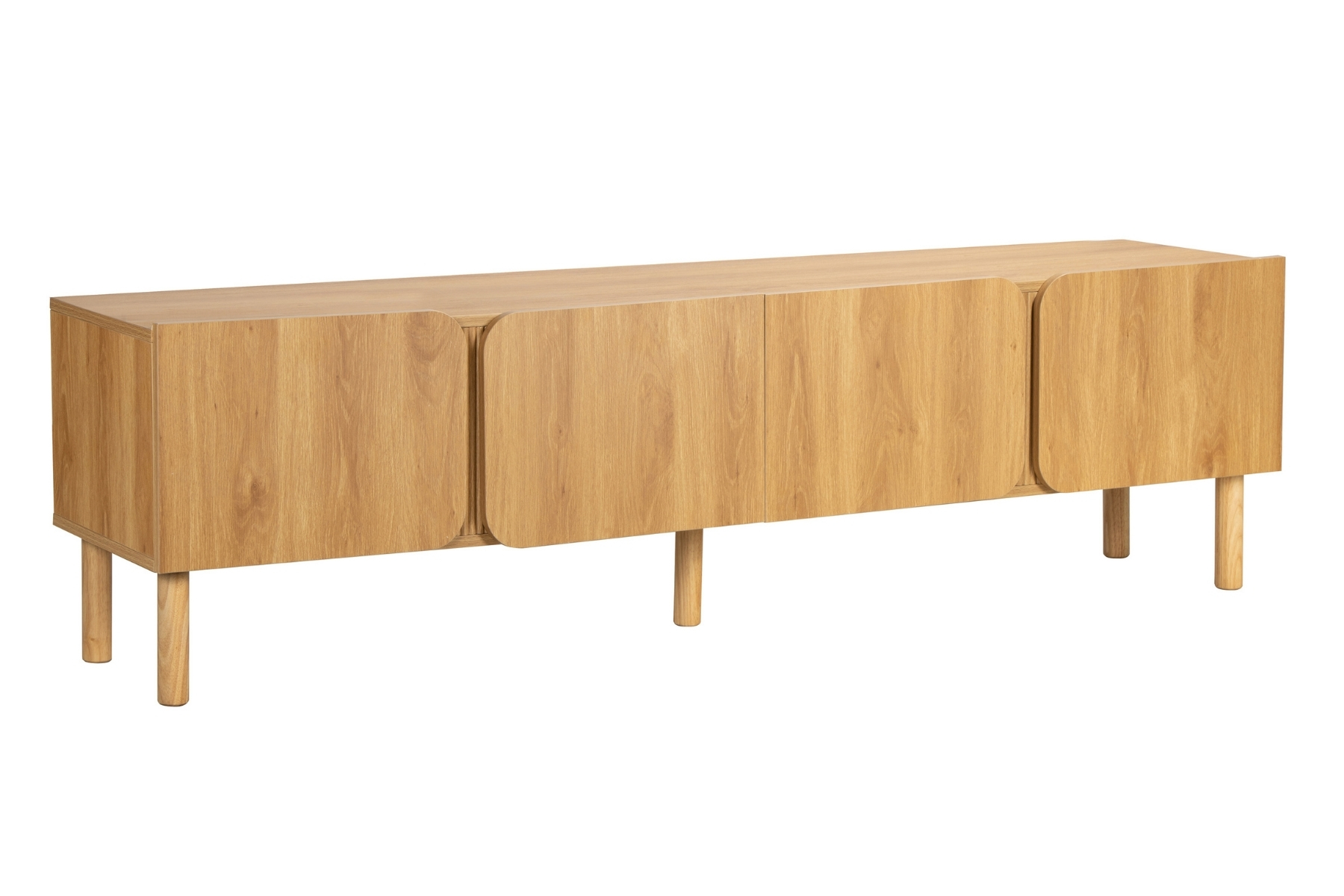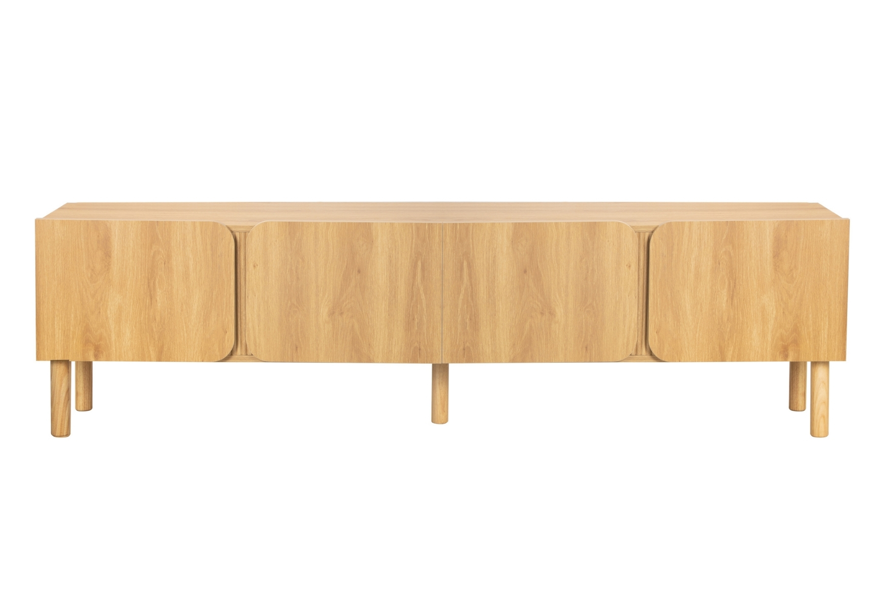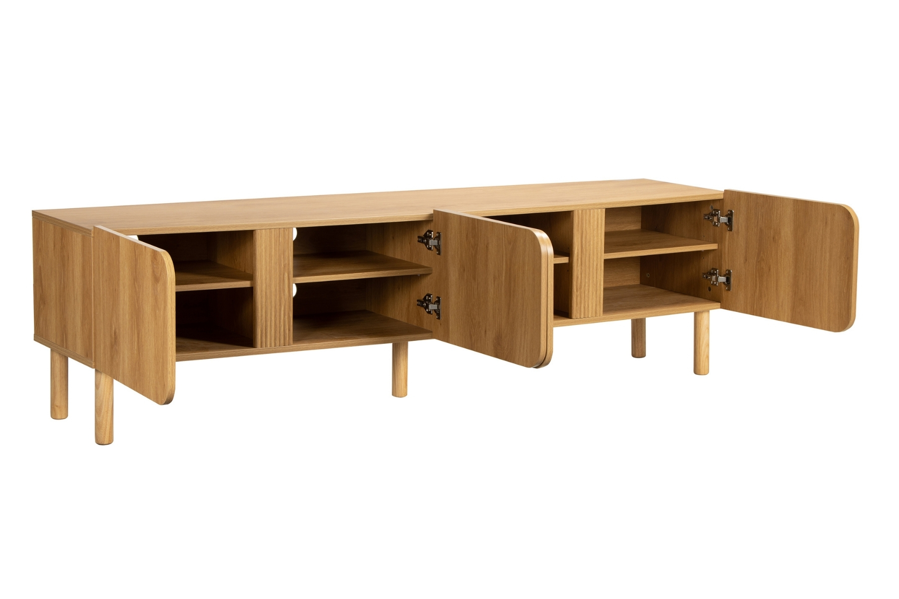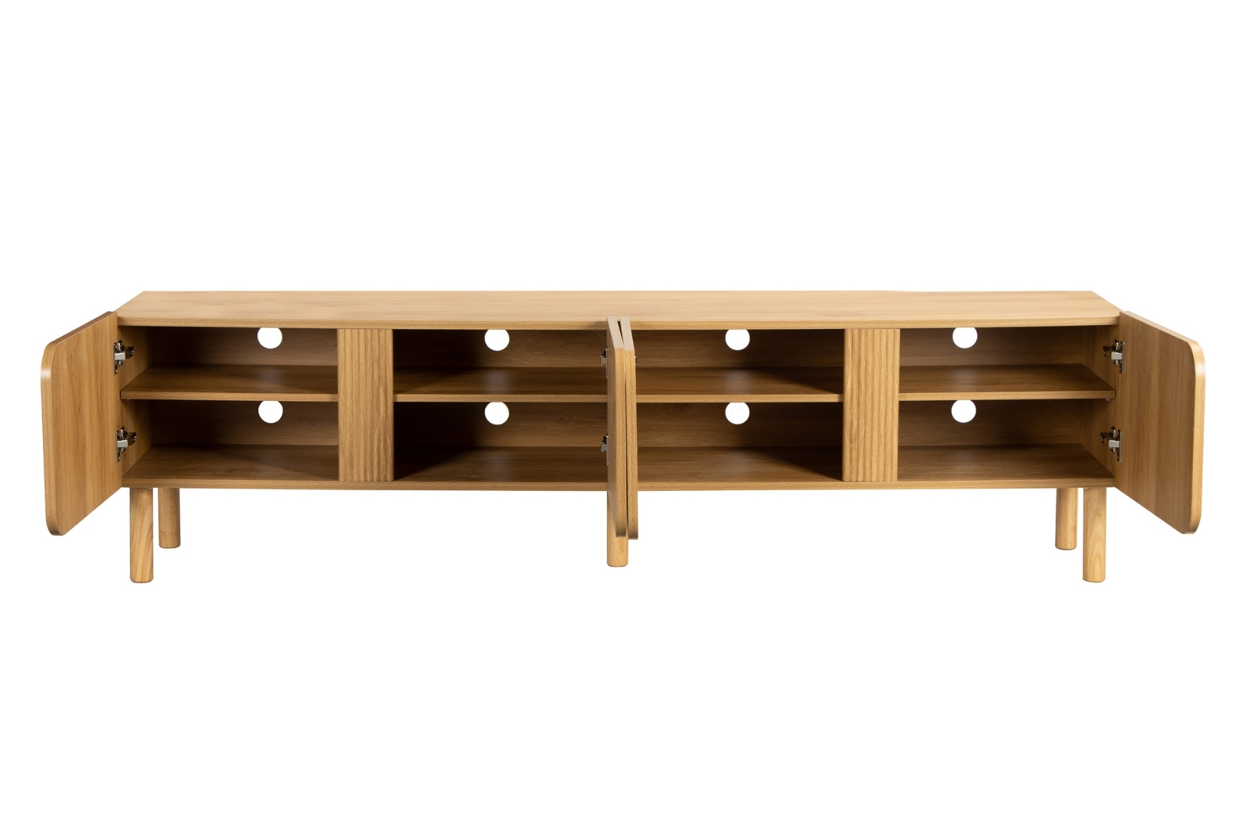 The design logic of the Inga 2m Oak Effect TV Unit is built around warmth and effortless Nordic charm. The oak effect finish brings an organic glow to your space, while the dual slatted accents add architectural interest without being showy. It features four smooth, rounded cupboard doors that eliminate hard edges, ensuring a big piece of furniture never feels like it is taking over the whole room.