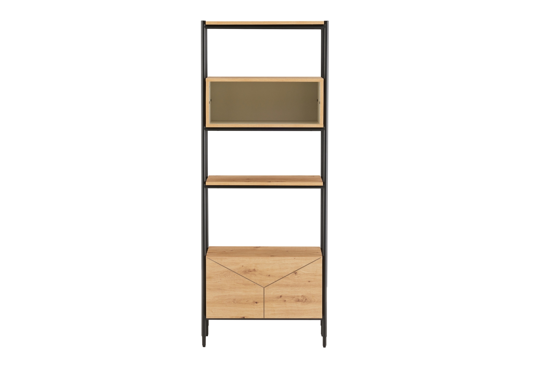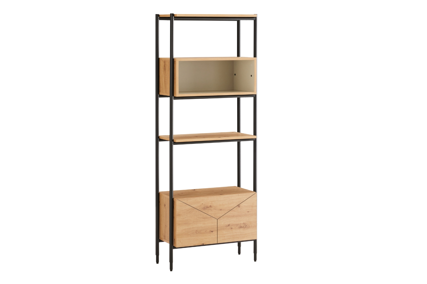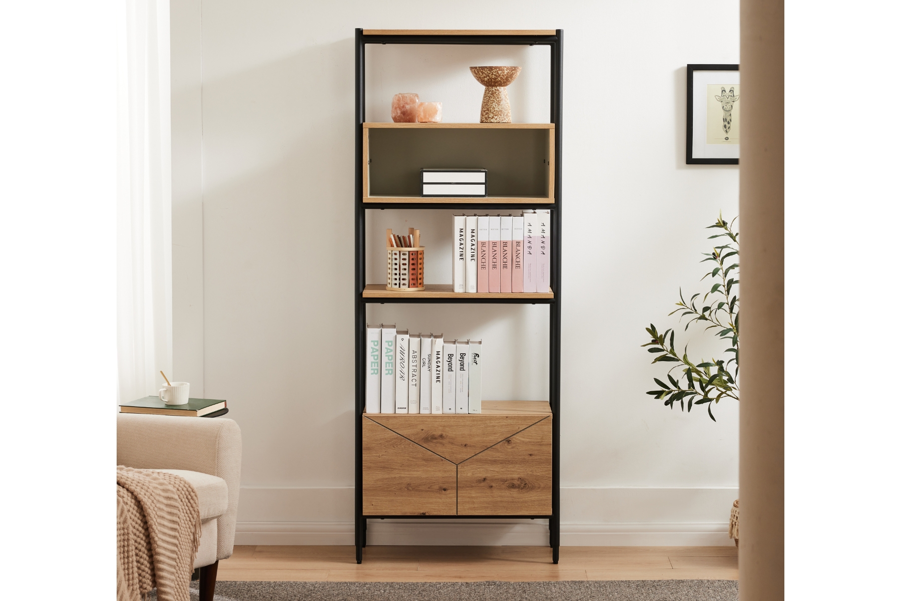 “Make the most of the 1.7m height by placing your tallest, lightest objects on the very top shelf. This prevents the unit from feeling top‑heavy and helps the room feel taller. Use the central cubby to zone specific items, like a small plant or a group of three ceramics, to create a focal point in the middle of the frame. We recommend anchoring the base by placing your heaviest art books or a thick storage basket on the bottom shelf near the drawer. This keeps the weight low and the unit looking balanced. For an Urban Modern look, pair the oak tones with charcoal or navy accessories and a matte black lamp to echo the metal frame. Leaving a few small gaps on each shelf will keep the display feeling fresh and uncluttered.”