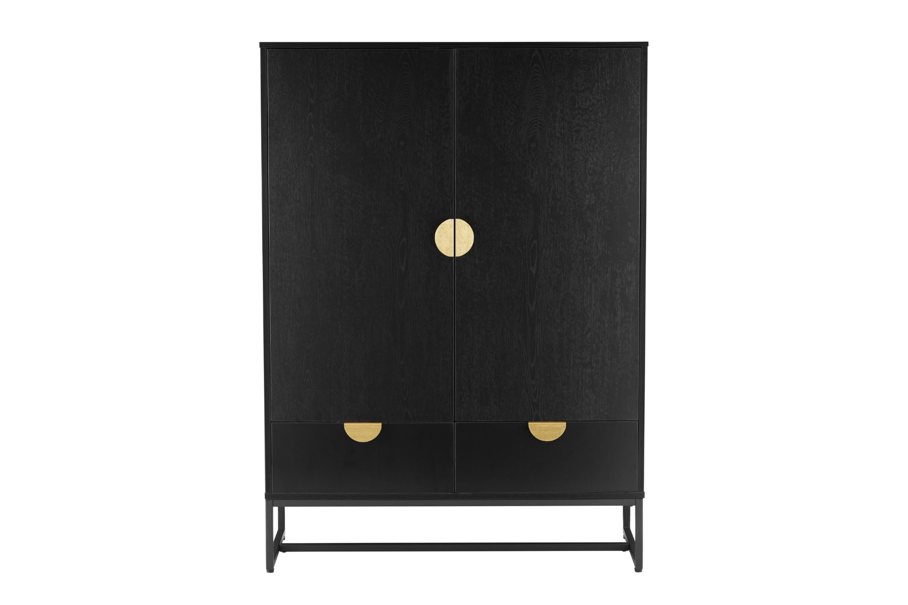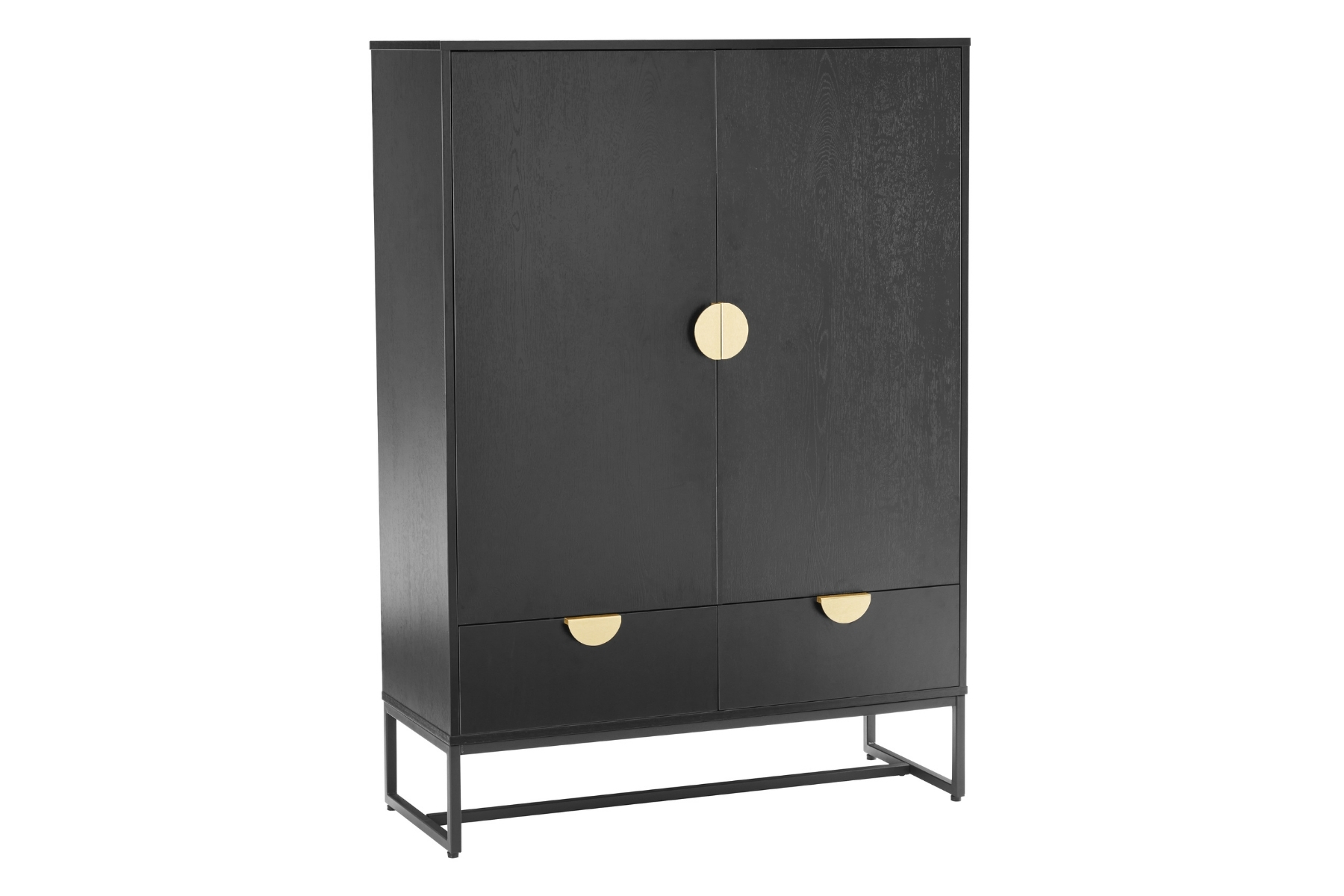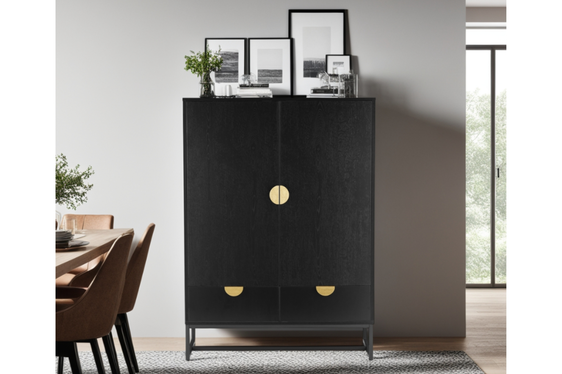 The black finish gives it visual weight without dragging the room down, and the slim metal frame keeps the whole thing feeling lifted. At 150cm tall, it’s got presence, but it still fits comfortably into tighter spaces. The two full-height doors open to handy shelves, so you can stash dinnerware, spare tech, board games or anything you want out of sight. Down below, the drawers are wide, smooth and soft-close. They’re ideal for paperwork, chargers, linens or everyday bits.