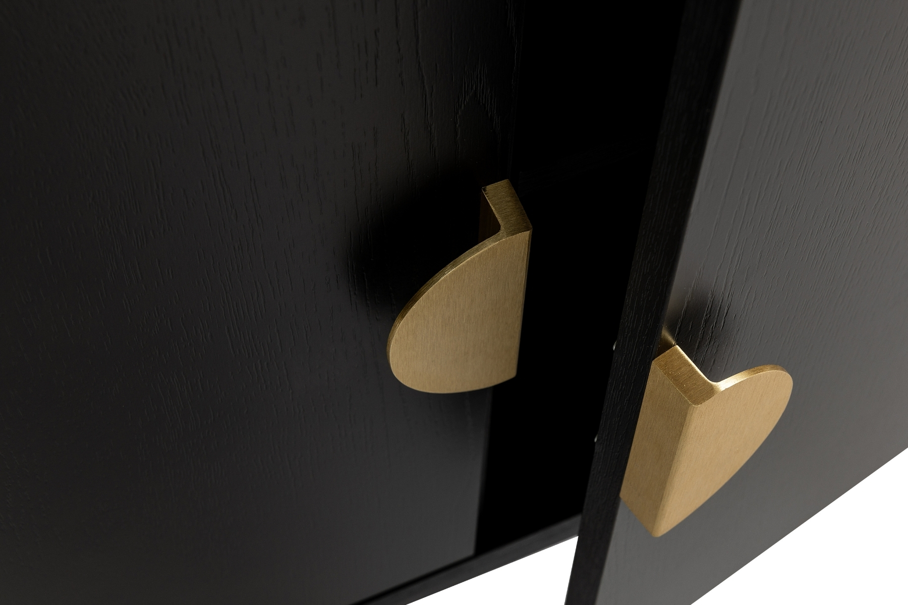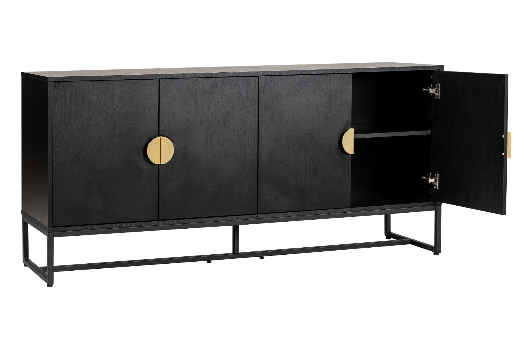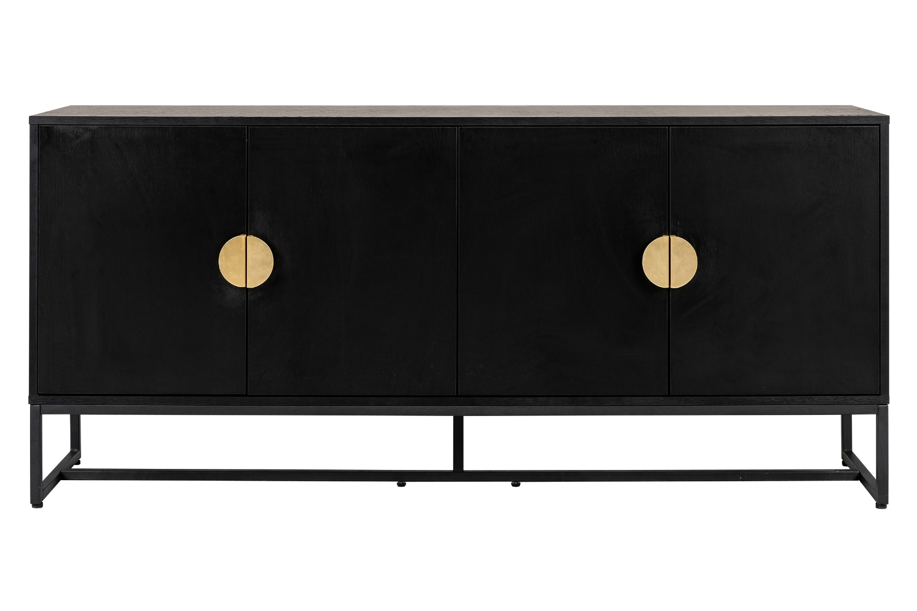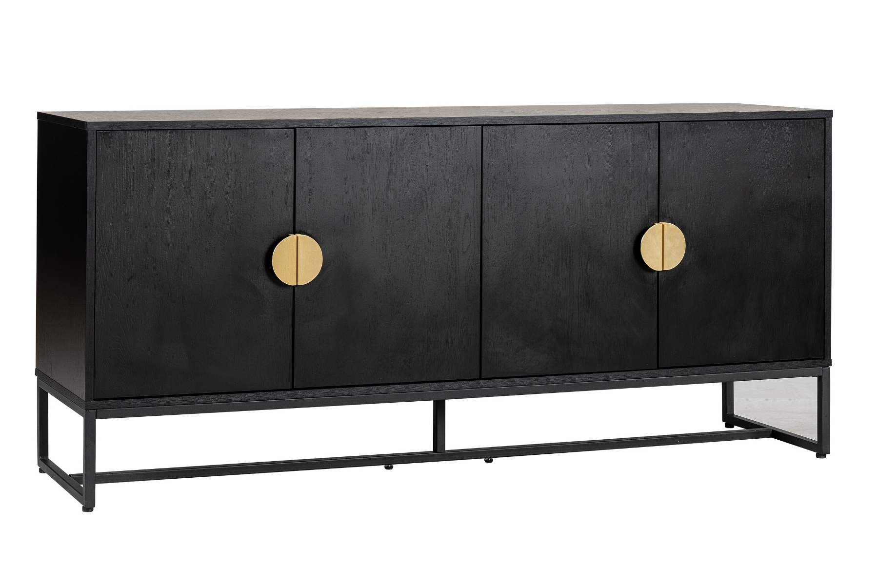 The design centres around a deep, bold black finish that’s grounding and quietly dramatic. This dark base works beautifully in homes with layered textures and pale walls, adding depth and contrast without overpowering the space. The sideboard sits on a slim, tidy black metal frame, keeping the whole piece feeling clean and lifted, even at a generous 1.6m wide. The brushed gold colour circular handles are the standout detail. They add a warm metallic flash against the dark body, giving the piece a confident, considered edge.