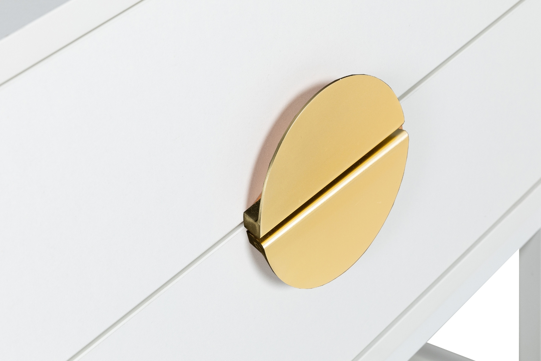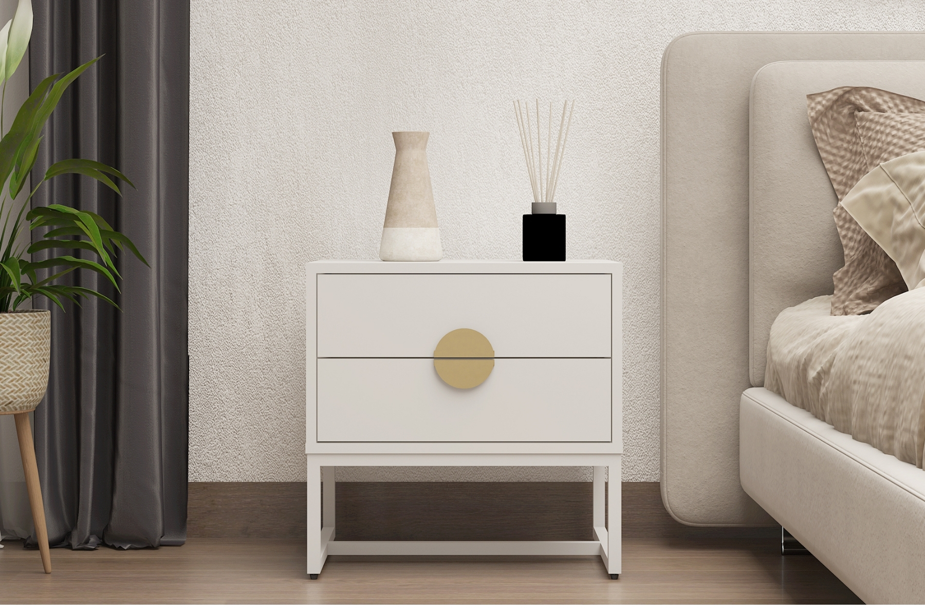 Built for modern bedrooms with a soft spot for Scandinavian charm, Oslo’s two drawers glide open on metal runners with a smooth, quiet pull. The crisp white finish acts as a clean backdrop, while the brushed gold-style handles add just enough polish to make the whole setup feel considered. The semi-circular gold colour pull becomes a sculptural detail when closed, elevating the Oslo above standard storage pieces.