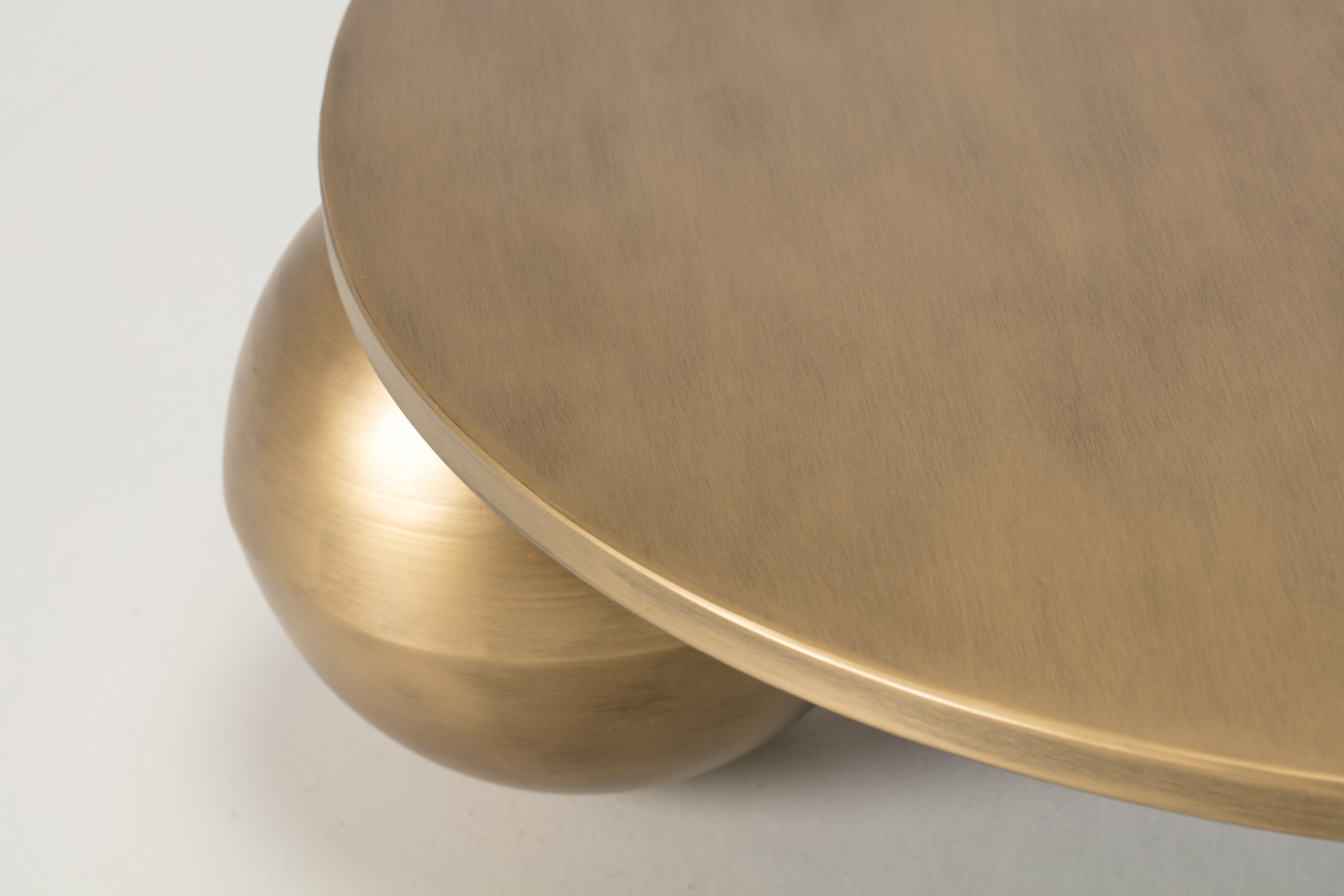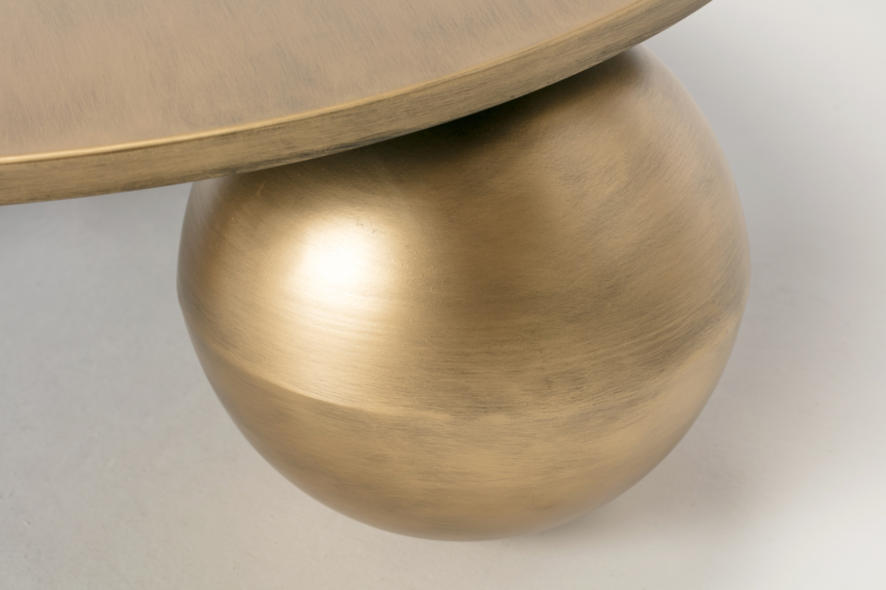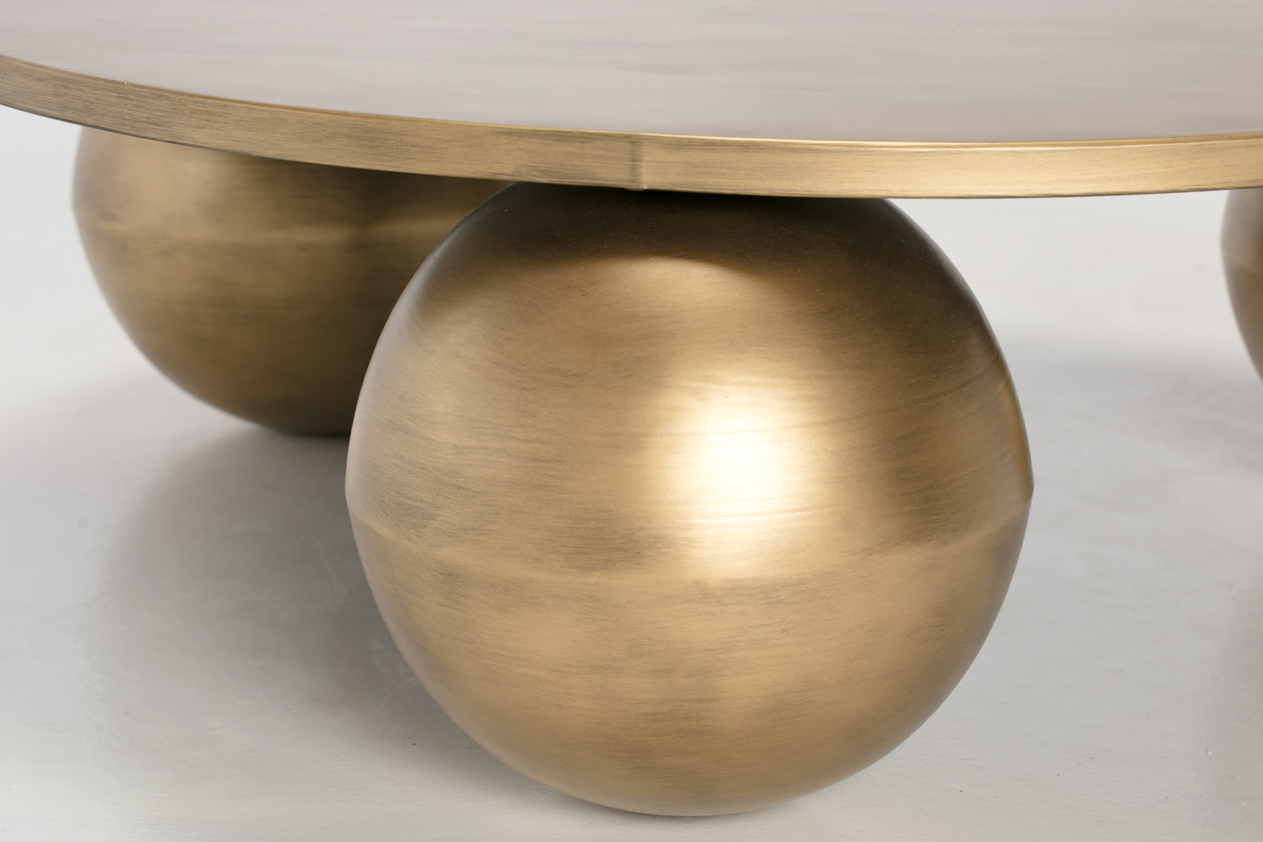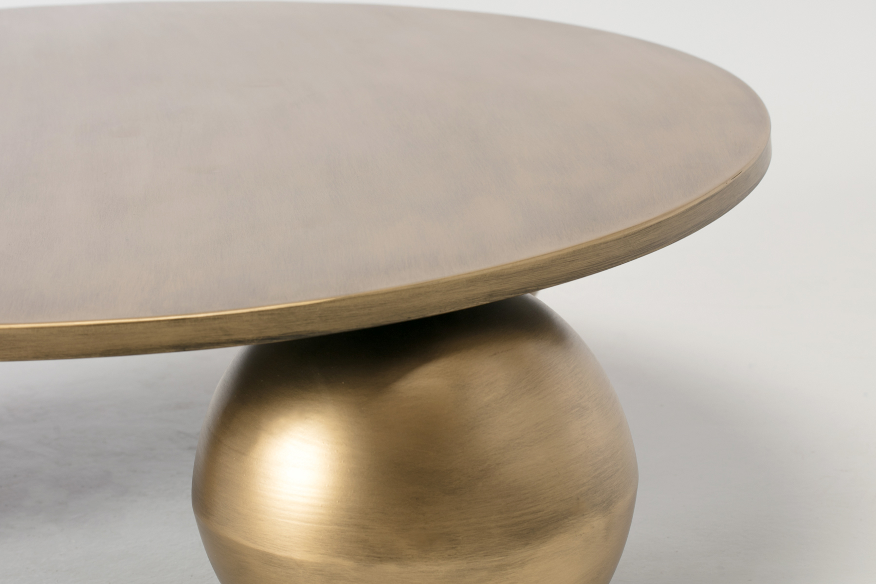 This round coffee table brings a sculptural feel to your living room. The brushed brass finish gives the surface a soft warm glow that catches the light without feeling shiny. The spherical base creates a calm sense of balance and gives the table a smooth grounded look. The round top keeps the shape gentle and easy to place in the centre of a room.