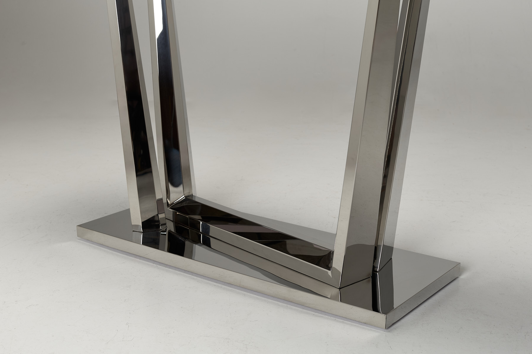 • Polished stainless steel base with a sculptural, geometric shape that catches the light and adds a bold, modern edge